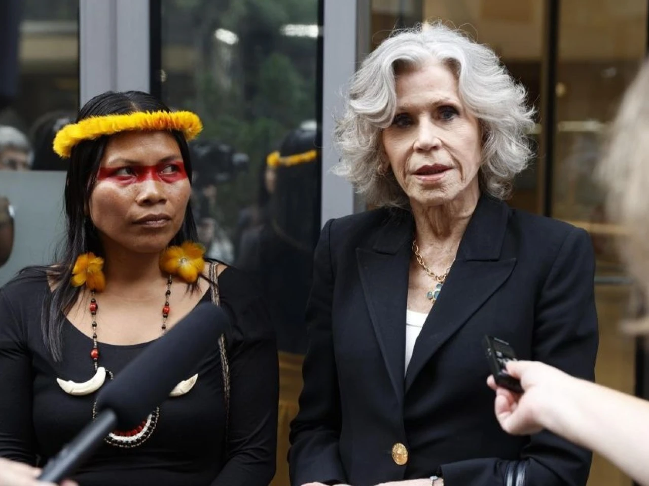 En Nueva York, Fonda y la lideresa waorani Nemonte Nenquimo presentaron a la prensa la campaña, en colaboración con la organización Amazon Frontlines.