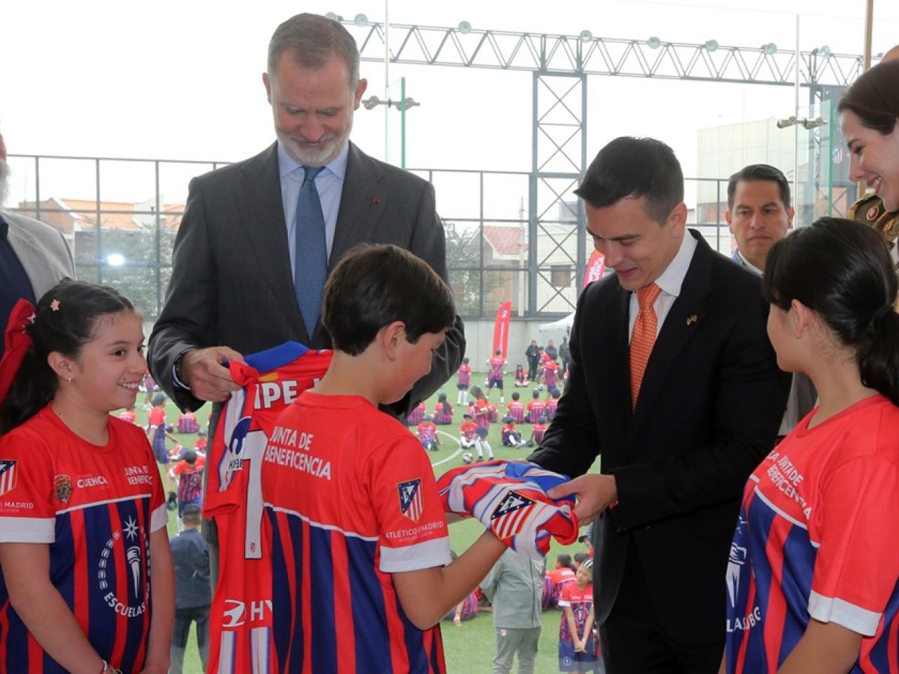 Cuenca- La red de escuelas de fútbol en Ecuador que impulsan la Junta de Beneficencia de Guayaquil (JBG) y el Atlético de Madrid sigue expandiéndose con un nuevo centro de formación inaugurado este jueves con la presencia del rey de España, Felipe VI, el presidente de Ecuador, Daniel Noboa, y el presidente del club rojiblanco, Enrique Cerezo.