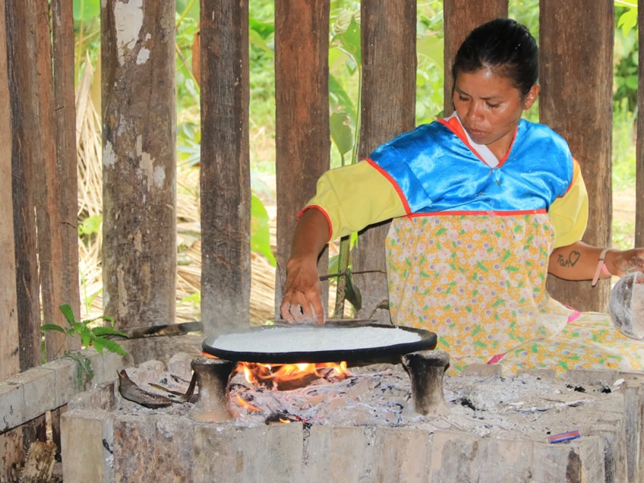 Los sabores y olores de estos alimentos pueden resultar, en un primer momento, fuertes y exóticos, como el ácido sabor de la chicha de yuca, conocida como masato en otros lares de la Amazonía; o el intenso y ahumado regusto que deja la hoja de bijao en la que se cocina envuelto el maito de bagre, uno de los platos favoritos en la comunidad.