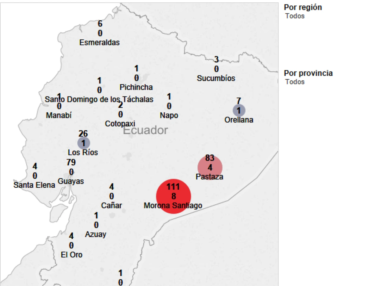 La región amazónica concentra la mayoría de pistas aéreas del país: 219 y de estas apenas 13 son estatales. Solo Morona Santiago registra 111 privadas y 8 públicas, seguido de Pastaza, con 83 y 4 respectivamente. En la Costa, Guayas encabeza la lista, con 79 y le sigue Los Ríos, con 26.