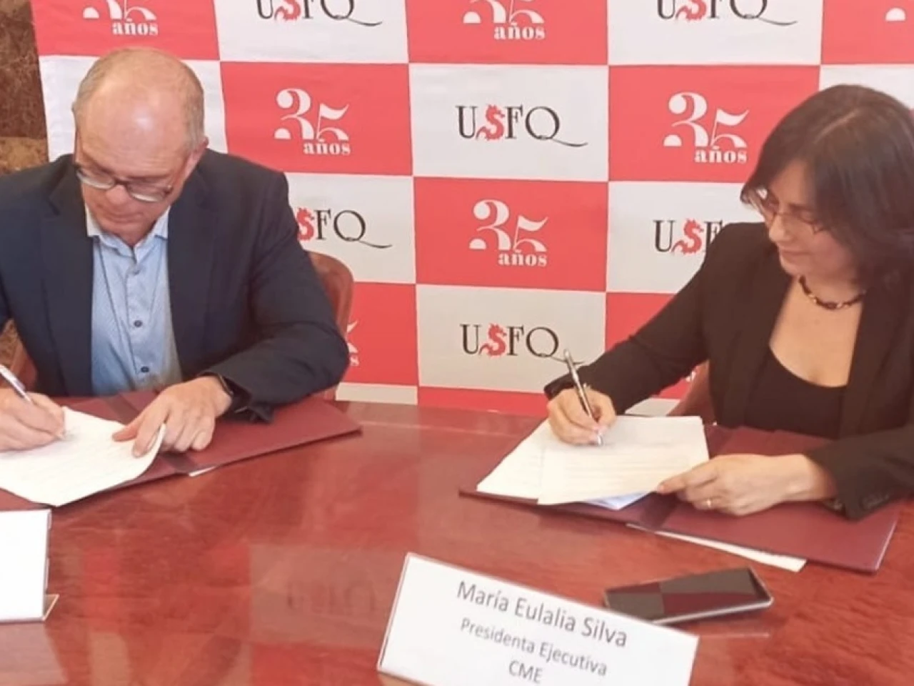 El evento tuvo lugar en las instalaciones de la USFQ. Contó con la presencia de autoridades de ambas instituciones. Diego Quiroga, rector de la USFQ, y María Eulalia Silva, presidente ejecutiva de la CME, formalizaron el compromiso.