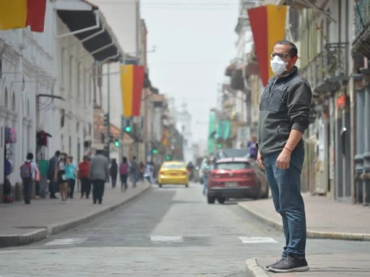 Vanesa Illescas, quien vive en el barrio San Pedro del Cebollar, en el norte de Cuenca, salió con su pequeño hijo con una mascarilla para cumplir algunos trámites en el centro. Lo hizo para evitar que el niño se agrave de la congestión respiratoria que padece.
