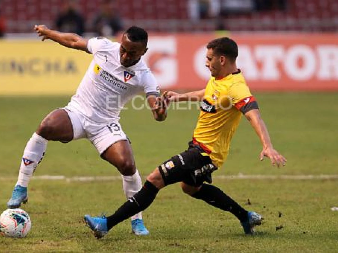 Pedro Pablo Parlaza se lleva el balón ante la marca de Emmanuel Martínez, en el partido de la fecha 4 de la LigaPro 2020 ante Barcelona. Foto: Julio Estrella / Archivo/ EL COMERCIO