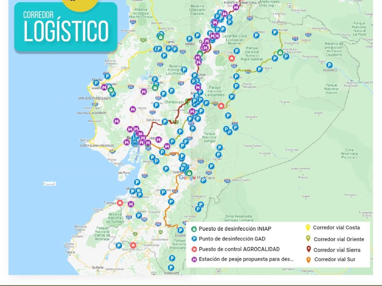 A partir del mes de abril de 2020, se creó la estrategia integral “Corredores logísticos” la misma que cuenta con cuatro corredores que sirven para abastecer de alimentos a los distintos mercados, cumpliendo con las debidas normas de protección y de bioseguridad. Los corredores logísticos son: Amazónico, Sierra, Sur y Costa, a lo largo de cada uno de ellos existen puntos de desinfección, instalados en coordinación con Gobiernos Autónomos Provinciales y Municipales.