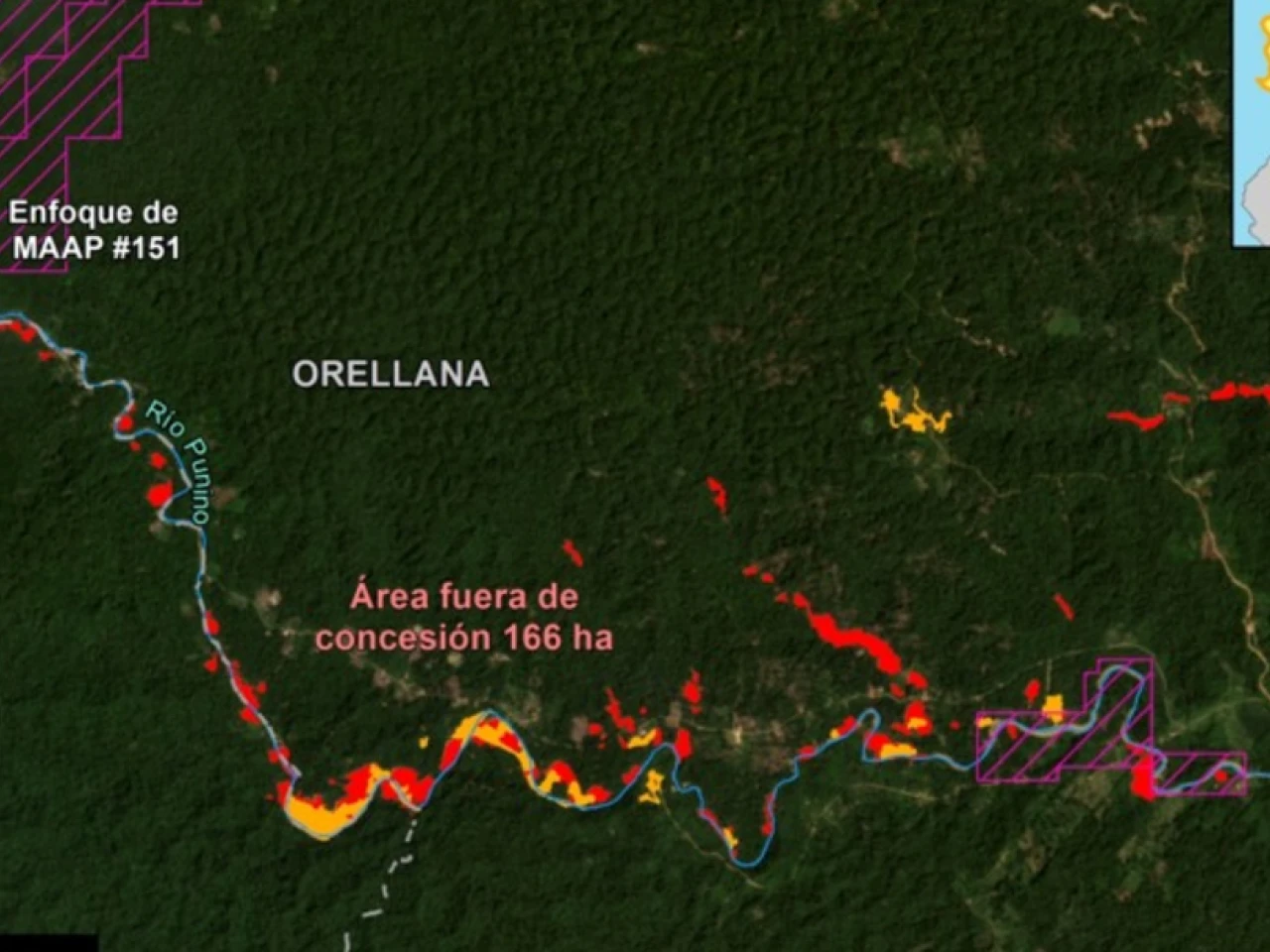 De acuerdo al MAAP, que se dedica a detectar los focos de deforestación en la Amazonía a través de imágenes de satélites de alta resolución, la mayoría de la superficie deforestada (166 hectáreas) está fuera de concesiones mineras, donde no está permitida esta actividad.