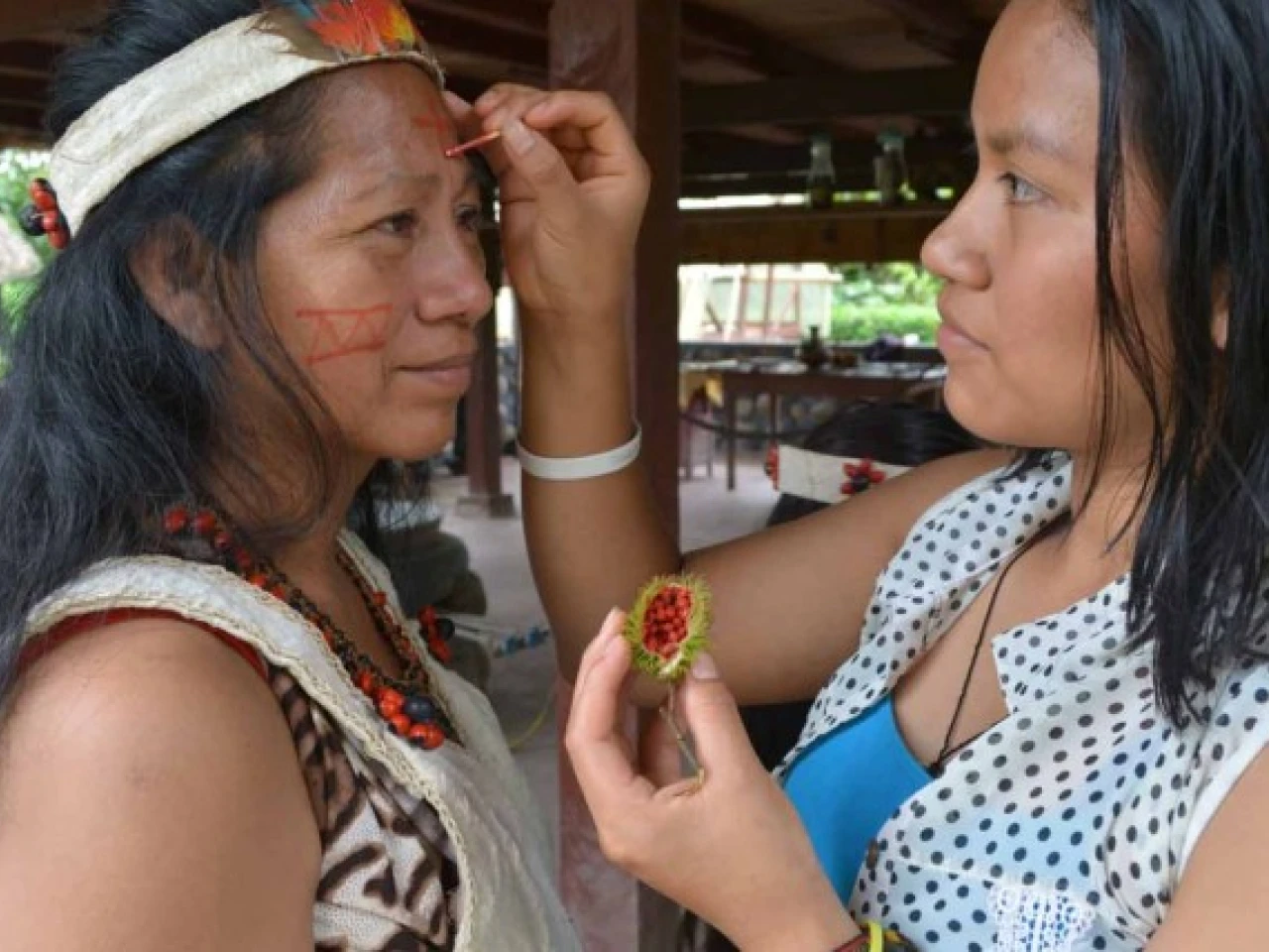 Katherine, a sus 20 años tiene la experiencia y la sabiduría suficiente para plasmar el rostro de su madre Claudia y de su hermanita de nueve años en un lienzo. Toma entre sus manos un achiote (vegetal de color rojo) y con una diminuta rama de árbol traza varias líneas. Cada figura tiene un significado, el de Claudia es el amor y la fuerza que pone por sacar adelante a su hogar.