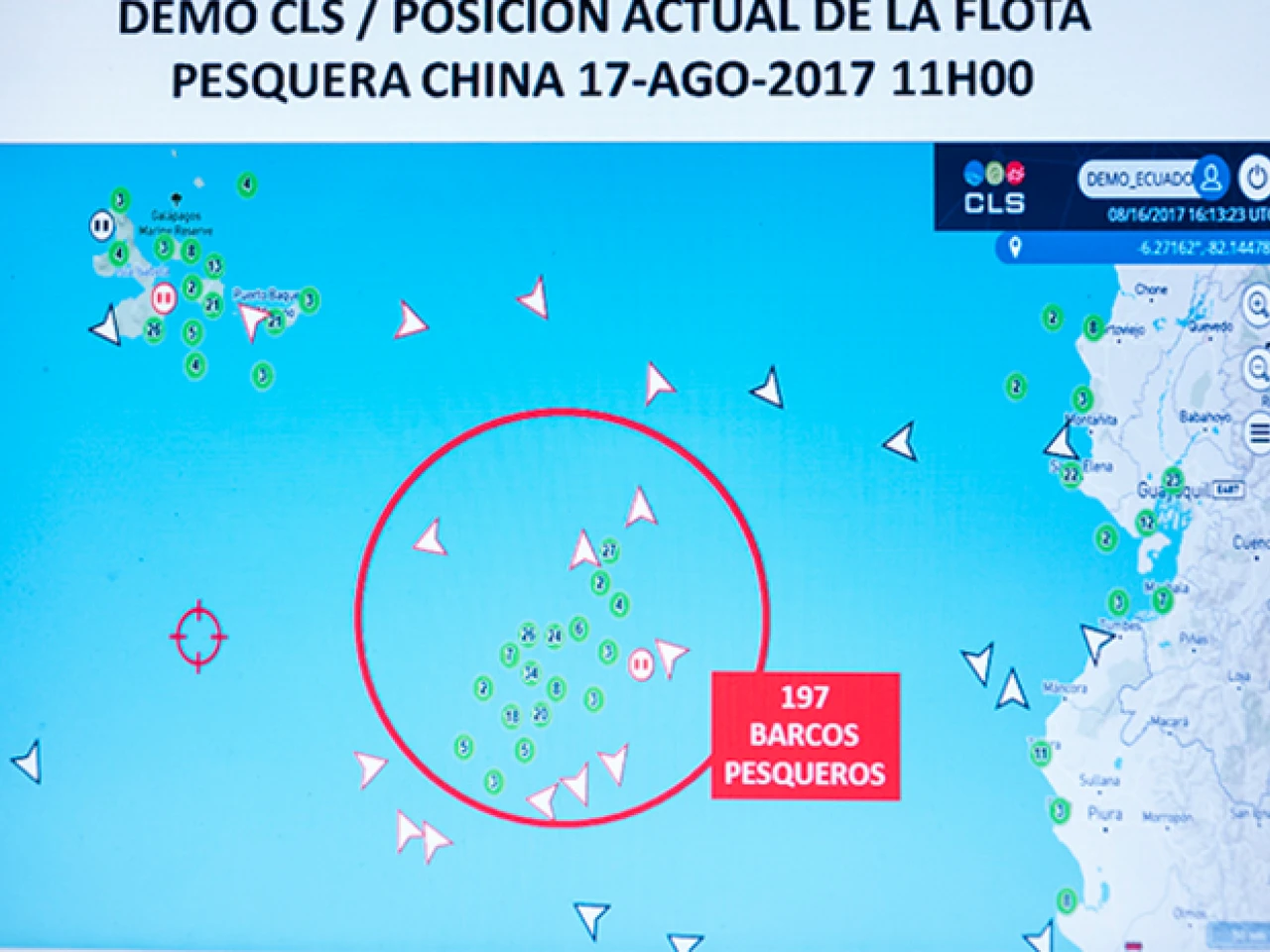 La imagen satelital muestra a la flota pesquera china, que se halla frente a las costas ecuatorianas y de las Galápagos, como una mancha gigantesca. Tan grande como la provincia del Guayas, ha dicho un militar ecuatoriano.