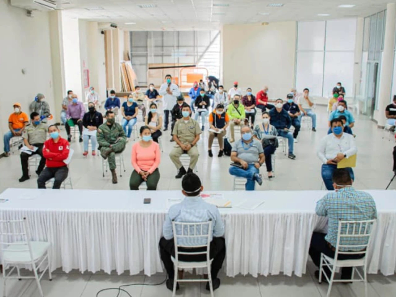 El 13 de mayo de 2020 se reunió el COE cantonal de Lago Agrio bajo las normas de distanciamiento social. - Foto: Cortesía Municipio de Lago Agrio