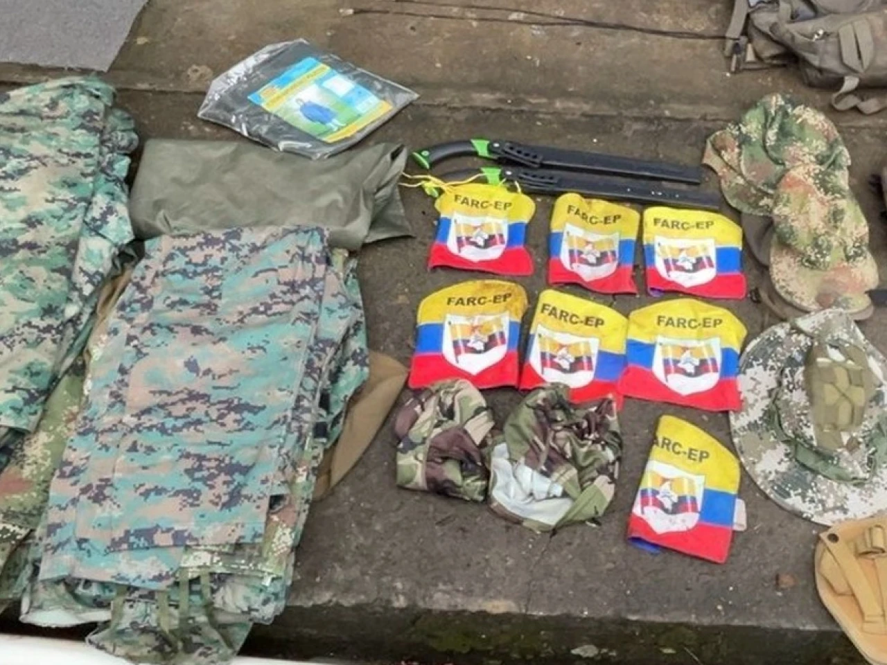 Después de asegurar el área, se registró el lugar. Se encontró: 3 fusiles de asalto Spikes Tactical Apopka calibre 5.56 mm; 1 carabina Mossberg calibre 12 mm; 1 pistola Pietro Beretta calibre 9 mm; 3 artefactos explosivos improvisados (AEI); 6 uniformes militares completos; 7 parches tricolor con siglas FARC EP; 1 radio Motorola; 3 teléfonos celulares, entre otros artefactos.