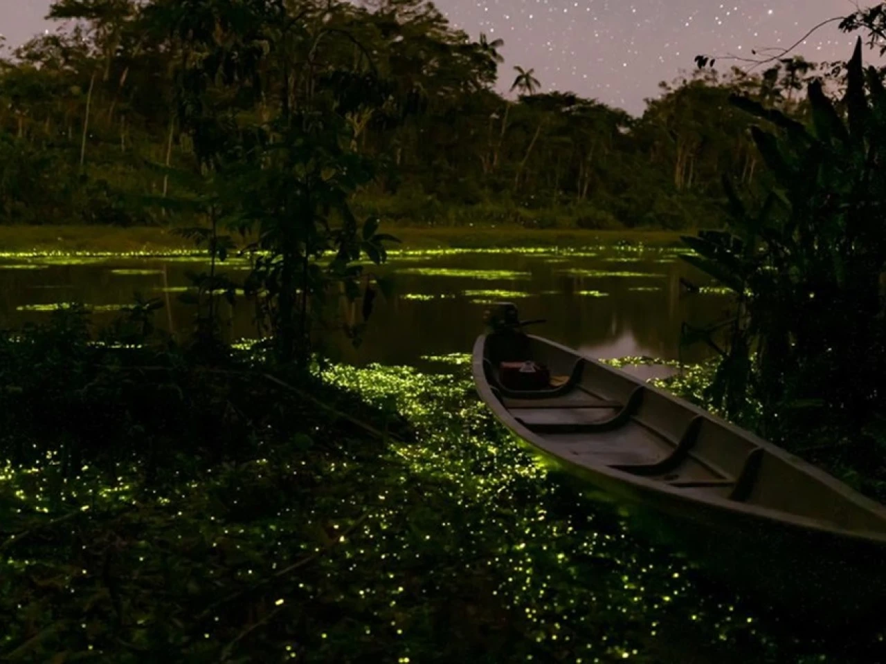 Pero es al anochecer cuando Limoncocha despliega su mayor encanto: un fenómeno de bioluminiscencia protagonizado por miles de luciérnagas que iluminan los lechuguinos flotantes. Durante aproximadamente media hora, este espectáculo natural transforma la oscuridad de la selva en un escenario de luces que solo puede describirse como mágico. Para no perturbar a estos diminutos seres brillantes, la experiencia se disfruta en completo silencio.
