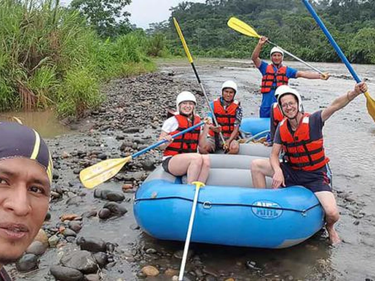 Al mismo tiempo de compartirles la manera correcta de abrocharse los chalecos salvavidas, ajustarse los cascos, ubicarse el faldón que va sobre la cintura y la bolsa de aire que evitaría que la embarcación se hunda y que puedan ser rescatados del río.