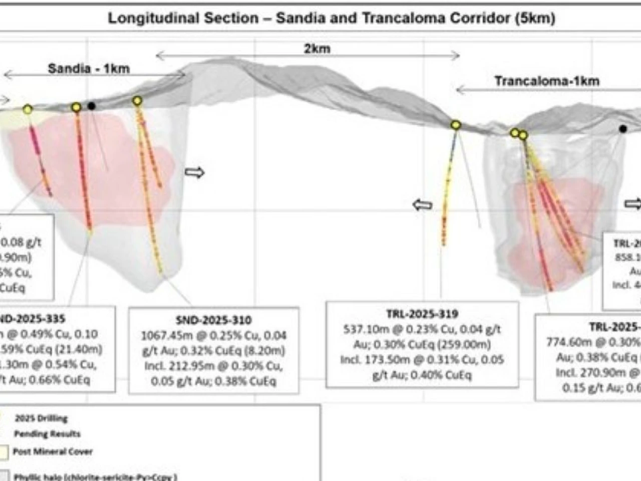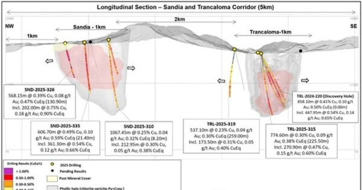 En Trancaloma, la perforación confirmó una amplia zona continua de cobre y oro que alcanza más de un kilómetro de longitud y mil metros de profundidad. Un pozo destacó con 774,6 metros de 0,38 % CuEq, incluyendo 270 metros con 0,60 % CuEq.
