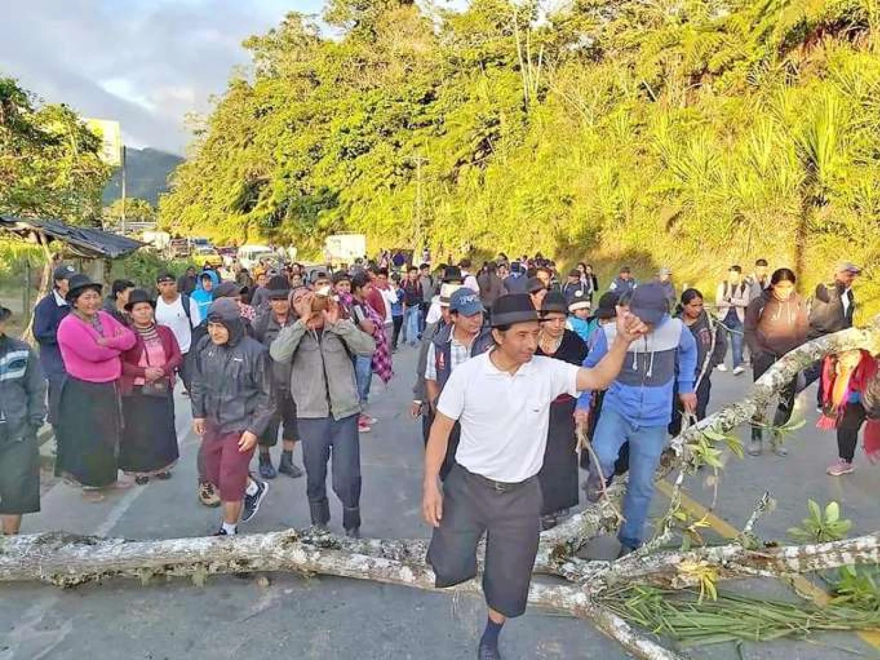 Los manifestantes que hacen presencia en la vía son integrantes de organizaciones sociales y otros son moradores de comunidades indígenas del cantón Yacuambi.