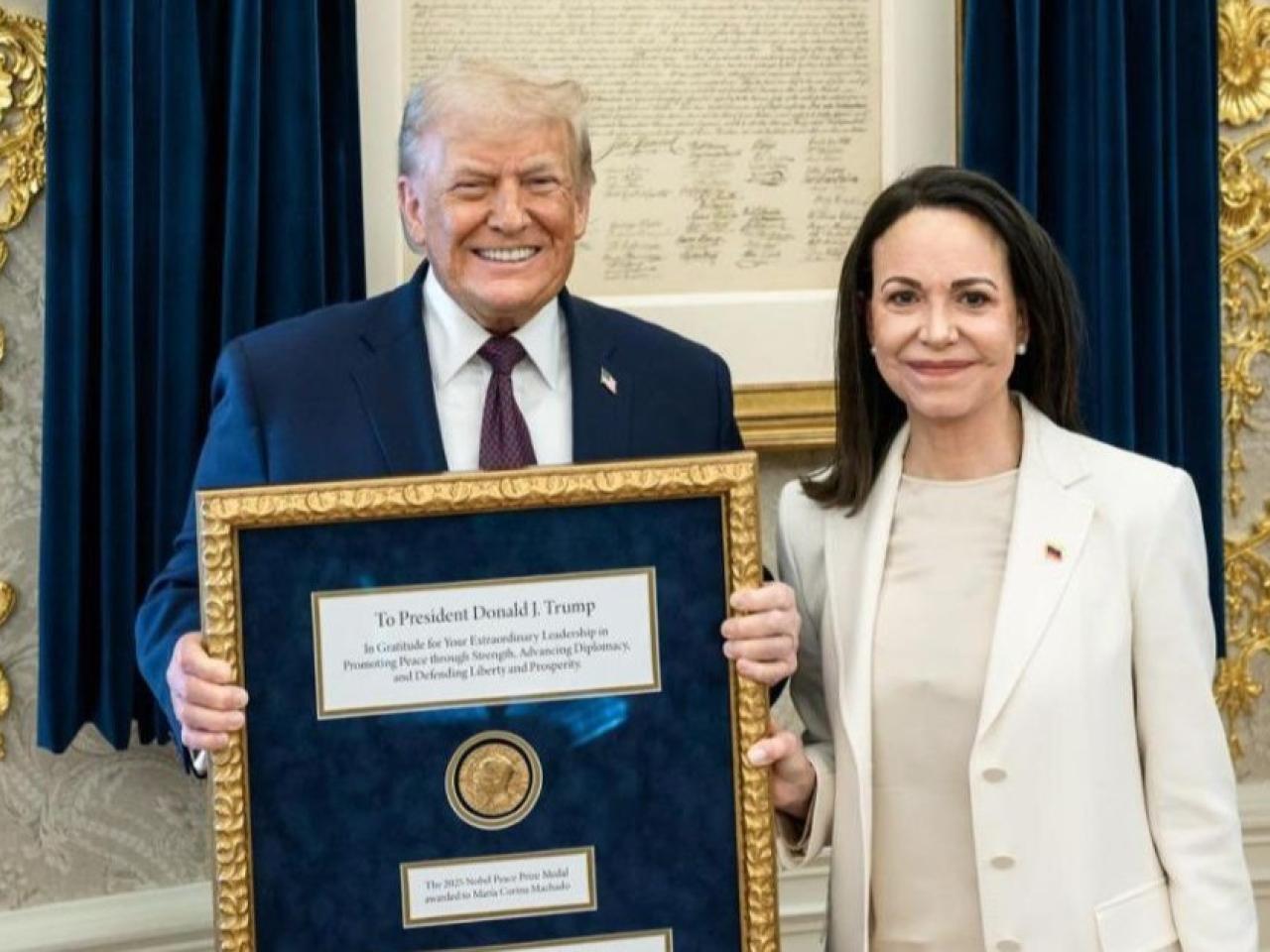 Washington- La líder de la oposición venezolana, María Corina Machado, entregó este jueves al presidente de EE.UU., Donald Trump, la medalla del Premio Nobel de la Paz, enmarcada con un mensaje de "gratitud" del pueblo venezolano por sus acciones para lograr "su libertad".