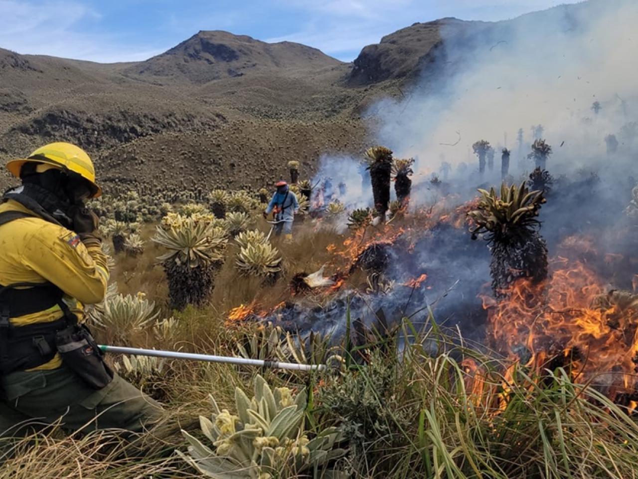 Más de 170 efectivos de varios cuerpos de bomberos de Ecuador combaten un incendio forestal en la reserva ecológica El Ángel, en la provincia andina de Carchi, fronteriza con Colombia, informó este sábado la Secretaría de Gestión de Riesgos (SGR).