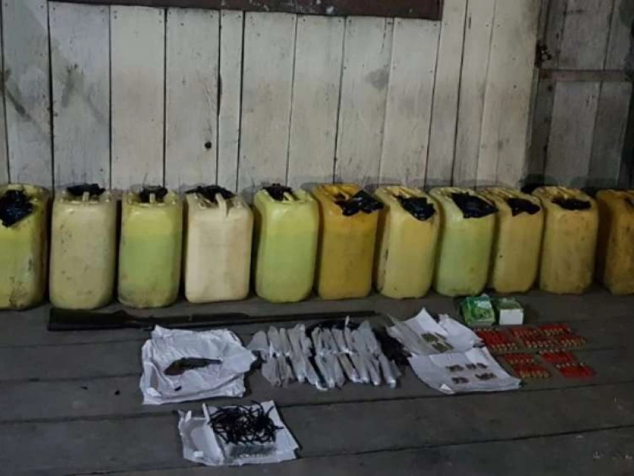 El Comando Conjunto de las Fuerzas Armadas, a través de un comunicado, detalló que el material incautado consistió en una carabina y un revólver de fabricación artesanal, 81 cartuchos de diverso calibre, 15 cápsulas ordinarias, 50 piezas de mecha lenta y 55 galones de combustible.