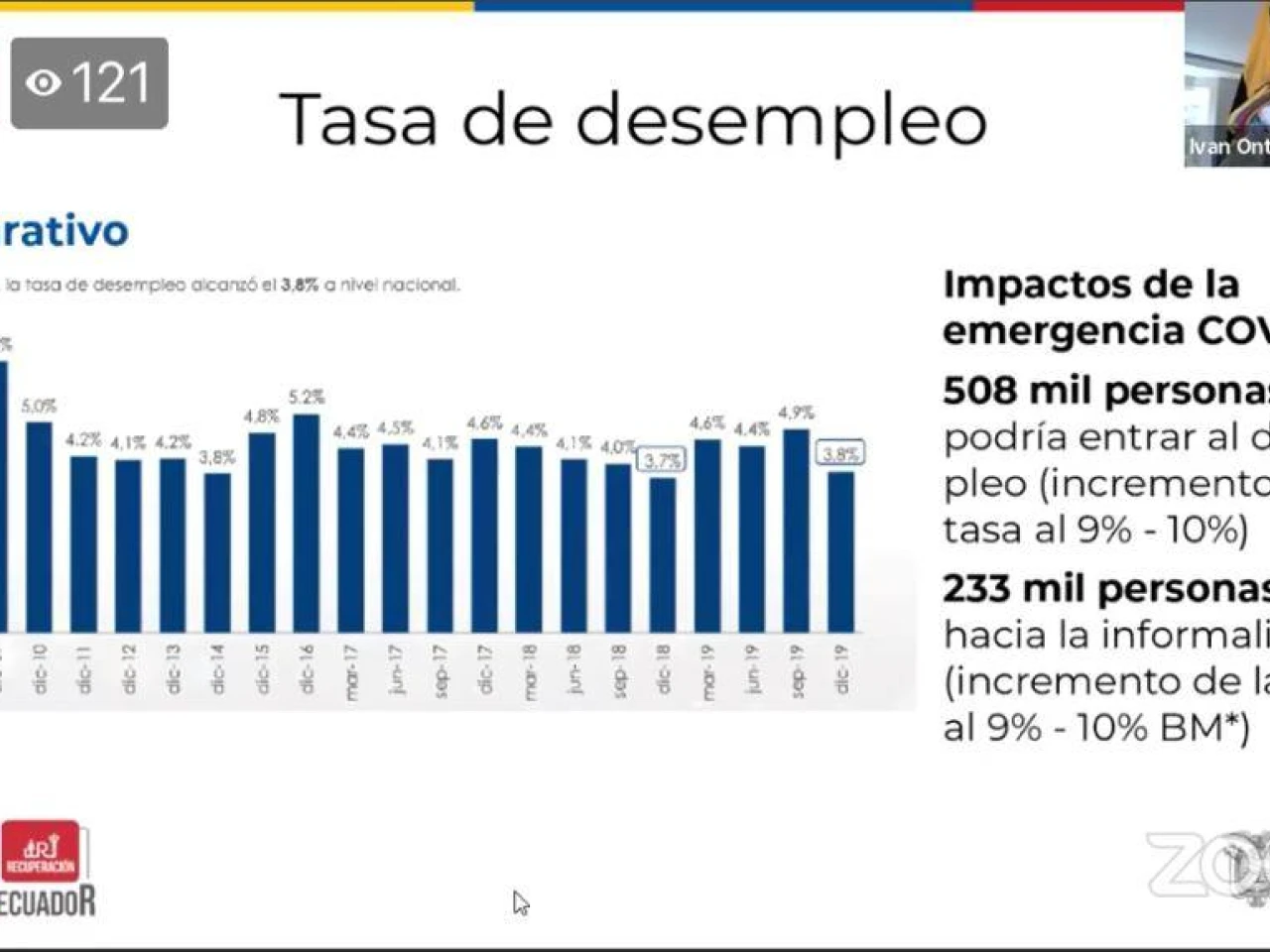 El ministro de Producción, Iván Ontaneda, aseguró que el impacto en el empleo por el coronavirus en Ecuador podría ser muy fuerte. Aseguró que 508 000 personas podrían entrar al desempleo y, el incremento de esta tasa sería del 9 % al 10 %, cuando en diciembre de 2019 dicho porcentaje era del 3.8 % a escala nacional. También dijo que la informalidad crecería en 233 000 personas, lo cual elevaría la tasa también un 9% o 10%, según datos entregados por el Banco Mundial.