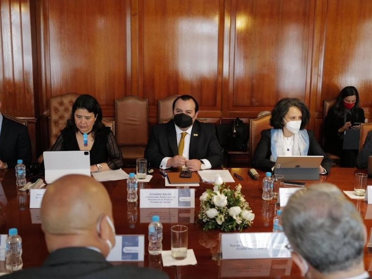 La misión de la CIDH también se reunió con el canciller, Mauricio Montalvo, y con representantes de la Comisión de Seguridad de la Asamblea Nacional, de los ministerios de Gobierno y de Defensa, así como de la Policía y del Servicio Nacional de Atención Integral a Personas Adultas Privadas de la Libertad y a Adolescentes Infractores del Ecuador (SNAI).