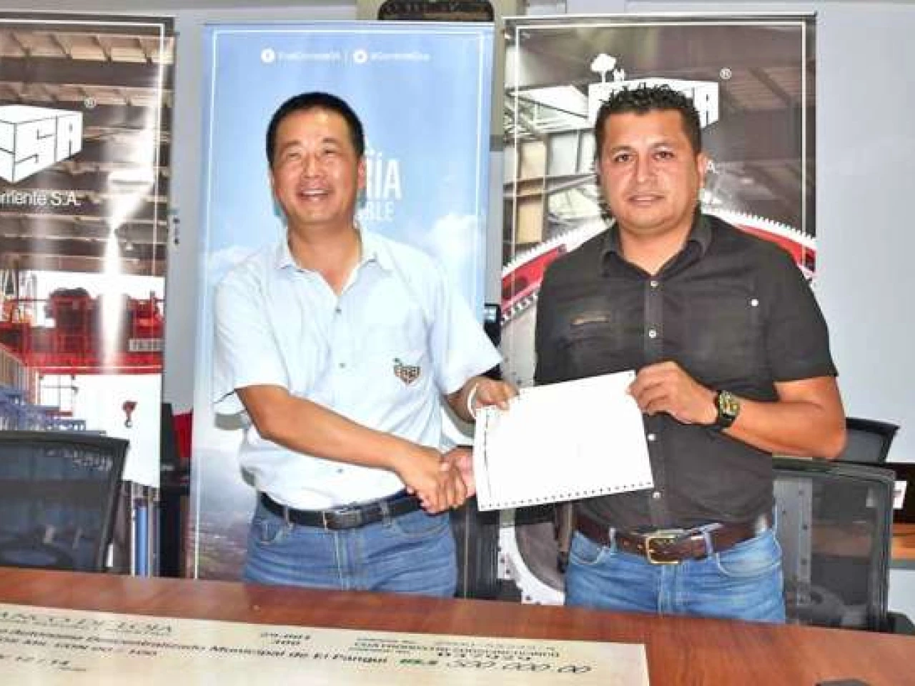 ACUERDO. Funcionario de ECSA hace la entrega de anticipo a Jairo Herrera, alcalde de El Pangui. Foto: La Hora