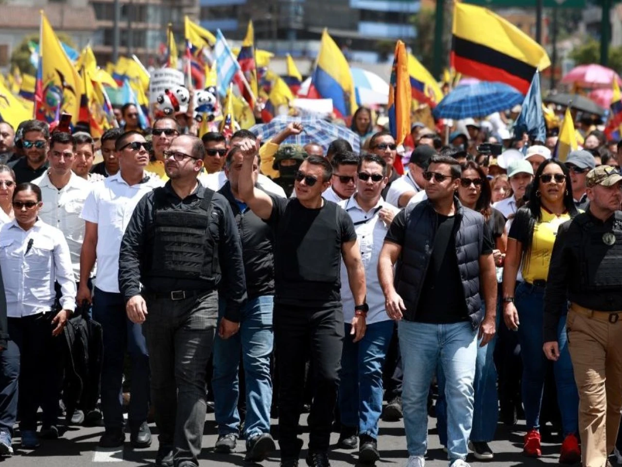 Noboa caminó firme con sus característicos lentes de sol, alzando el puño de tanto en tanto y saludando a los manifestantes al ritmo de los himnos patrios.