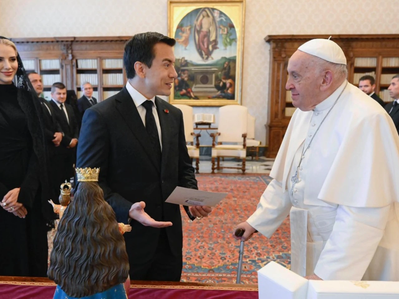 Ciudad del Vaticano.- El papa Francisco se reunió hoy durante 30 minutos en el Vaticano por primera vez con el presidente de Ecuador, Daniel Noboa, quien le regaló una reproducción de la Virgen del Cisne, realizada por artesanos de su país.