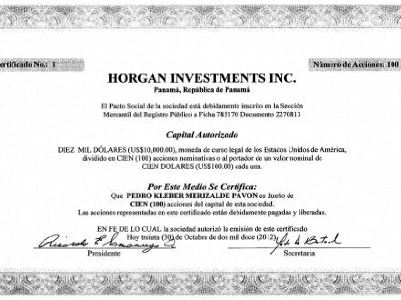 El certificado de acciones de Horgan que recibió Merizalde tienen un valor nominal de $ 10.000. El documento está fechado el 30 de octubre del 2012, cuando él era gerente general de la Refinería del Pacífico.