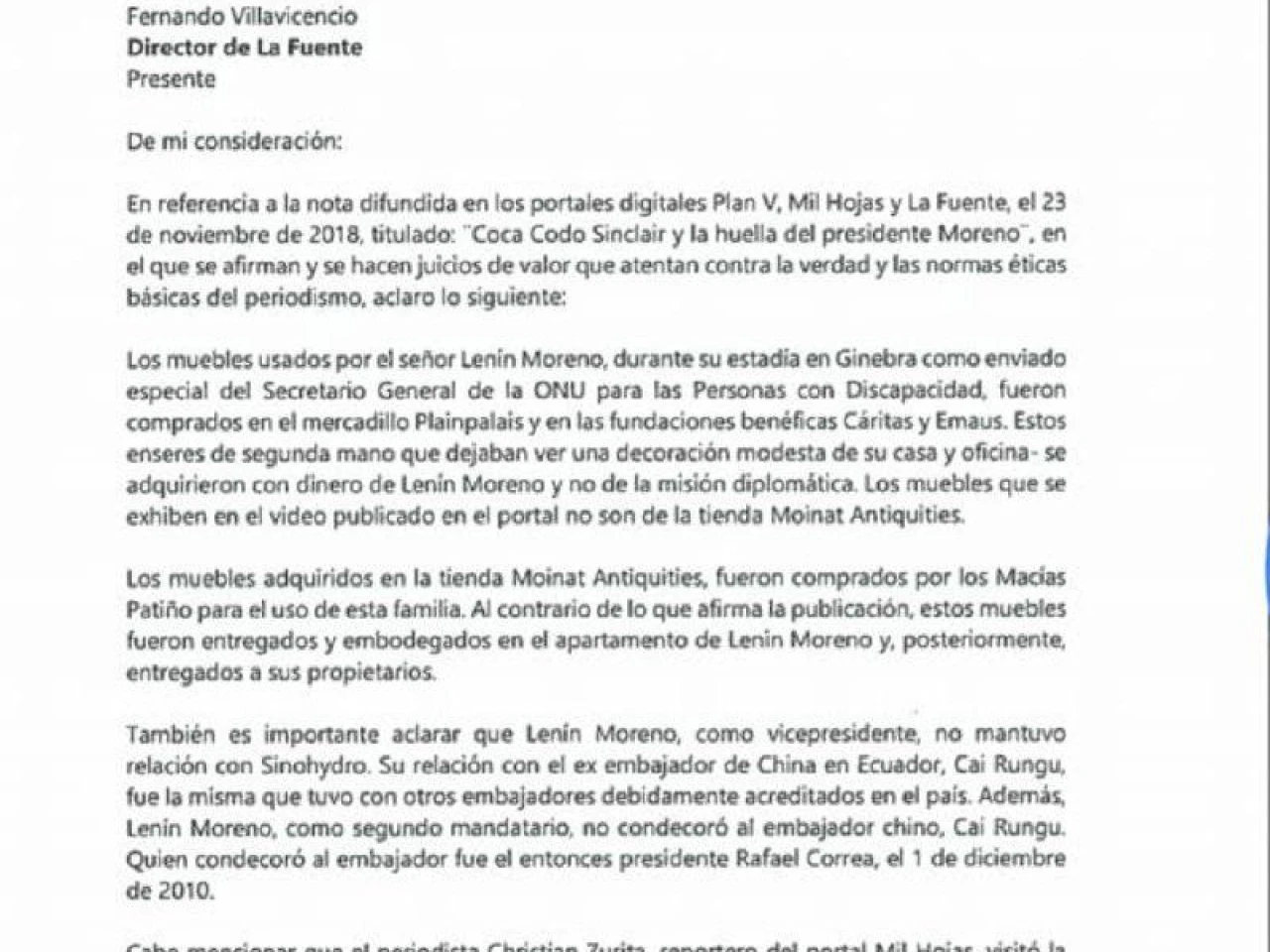 Una publicación de los portales digitales Plan V, La Fuente y Mil Hojas señala que los muebles del departamento que ocupó Lenín Moreno, en Ginebra, cuando en 2015 fue enviado Especial del secretario general de las Naciones Unidas para Discapacidad, fueron adquiridos por la compañía INA Investment Corp. Esta empresa está vinculada a Conto Patiño Martínez, uno de los contratistas de la china Sinohydro, constructora de la cuestionada hidroeléctrica Coca Codo Sinclair.