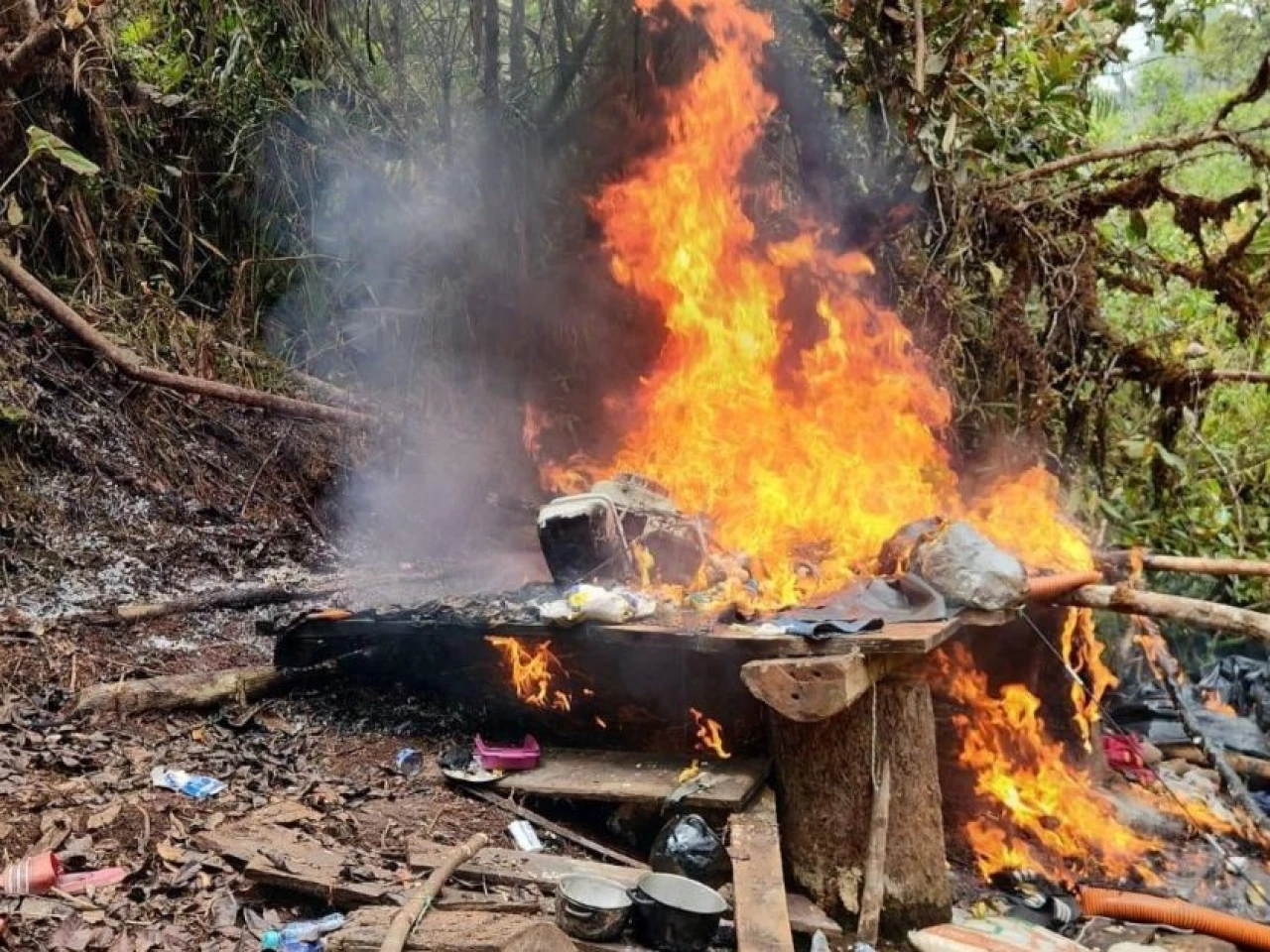 El Pangui- Dos campamentos vinculados a actividades de minería ilegal fueron desmantelados en el sector de Tundayme, cantón El Pangui, en la provincia de Zamora Chinchipe, durante un operativo ejecutado por las Fuerzas Armadas del Ecuador.