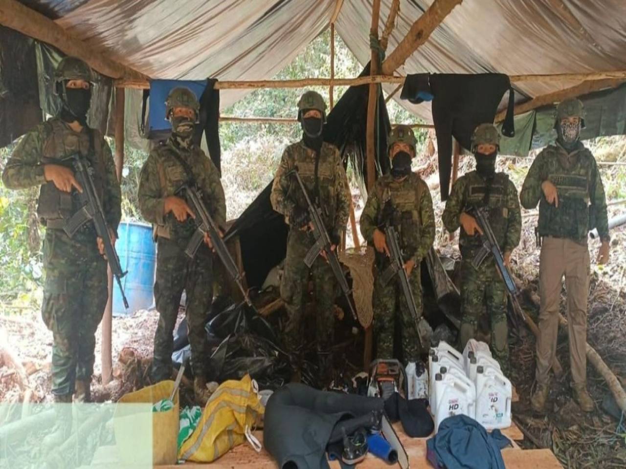 Durante el procedimiento incautaron maquinaria y equipos utilizados para la extracción ilícita de minerales, incluyendo una excavadora, una máquina clasificadora, un generador eléctrico y una alimentadora. Además, se decomisaron dos armas de fuego, municiones de distintos calibres y varios teléfonos móviles.