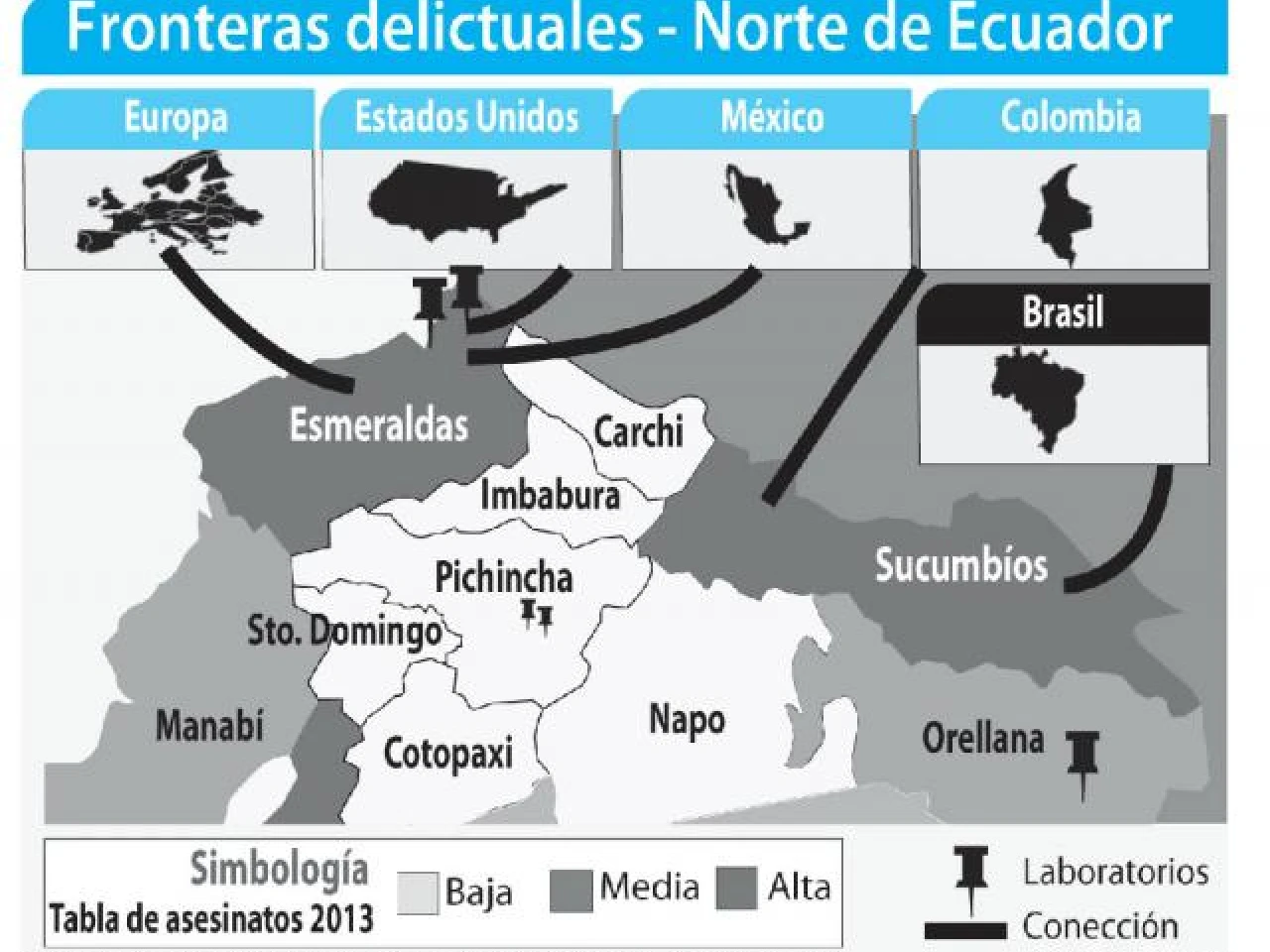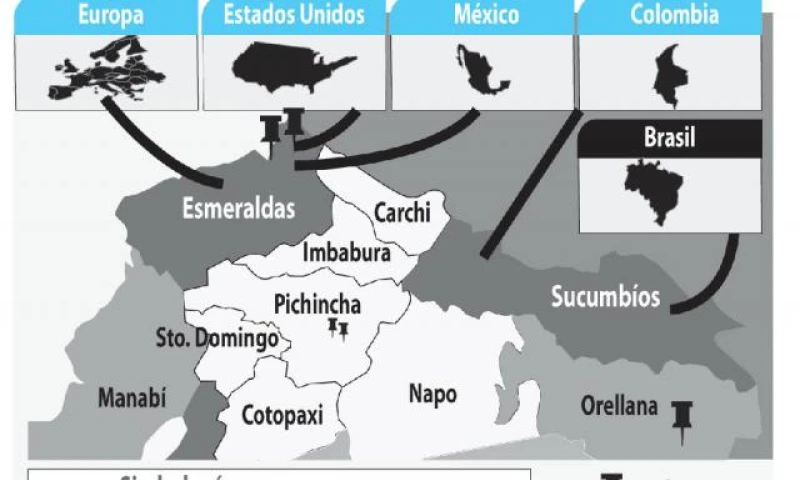 En el informe también se resalta que desde la frontera con Esmeraldas, los grupos irregulares dirigen sus actividades ilícitas hacia Europa, Estados Unidos y México, mientras que desde la frontera con Sucumbíos se dirigen hacia Colombia y Brasil. (Ver gráfico)