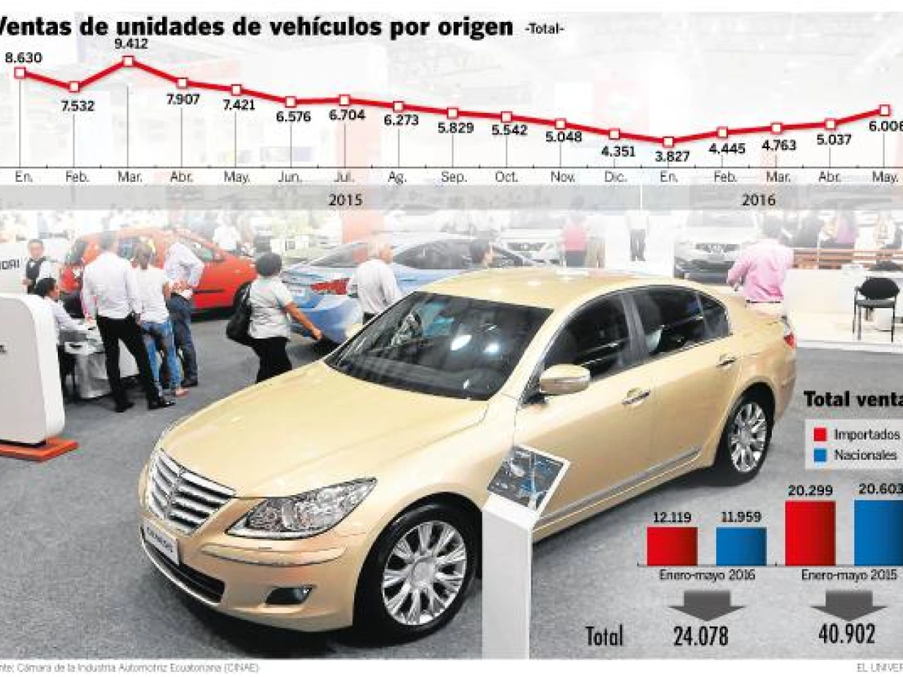 La caída de ventas de autos en el Ecuador ha hecho retroceder al mercado a los niveles de hace 15 años, asegura David Molina, presidente de la Cámara de la Industria Automotriz Ecuatoriana (Cinae). En los últimos tres años se ha ido pronunciando la baja: mientras en 2014 se vendieron aproximadamente 120.000 unidades, para el 2015 la cifra fue de 80.000; y para 2016 se llegaría a 50.000.