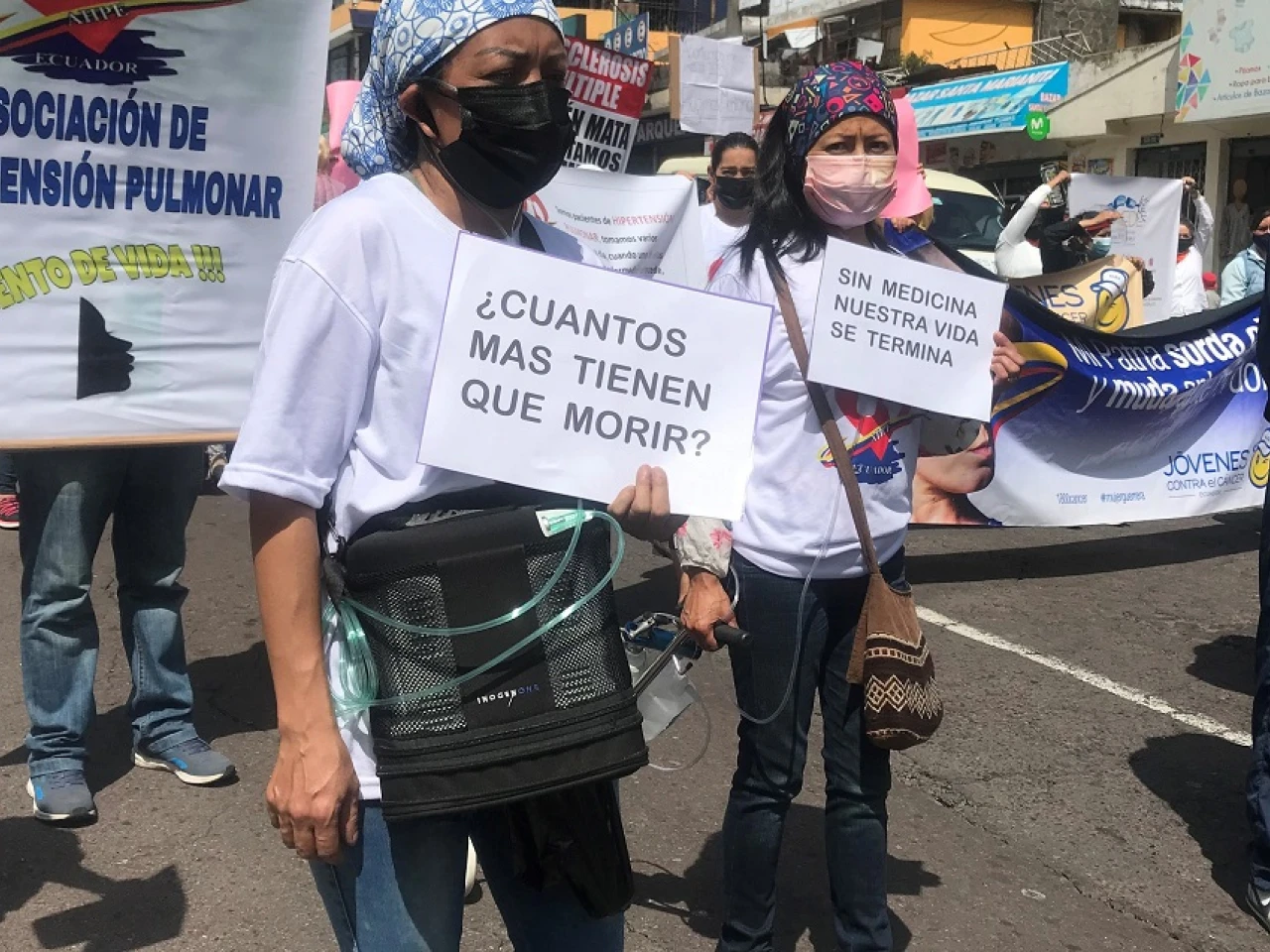 En los plantones convocados en las tres principales ciudades de Ecuador también participó el Observatorio de Lucha contra el Cáncer, aparte de pacientes que caminaban con bombonas de oxígeno y familiares de ingresados en terapia intensiva.