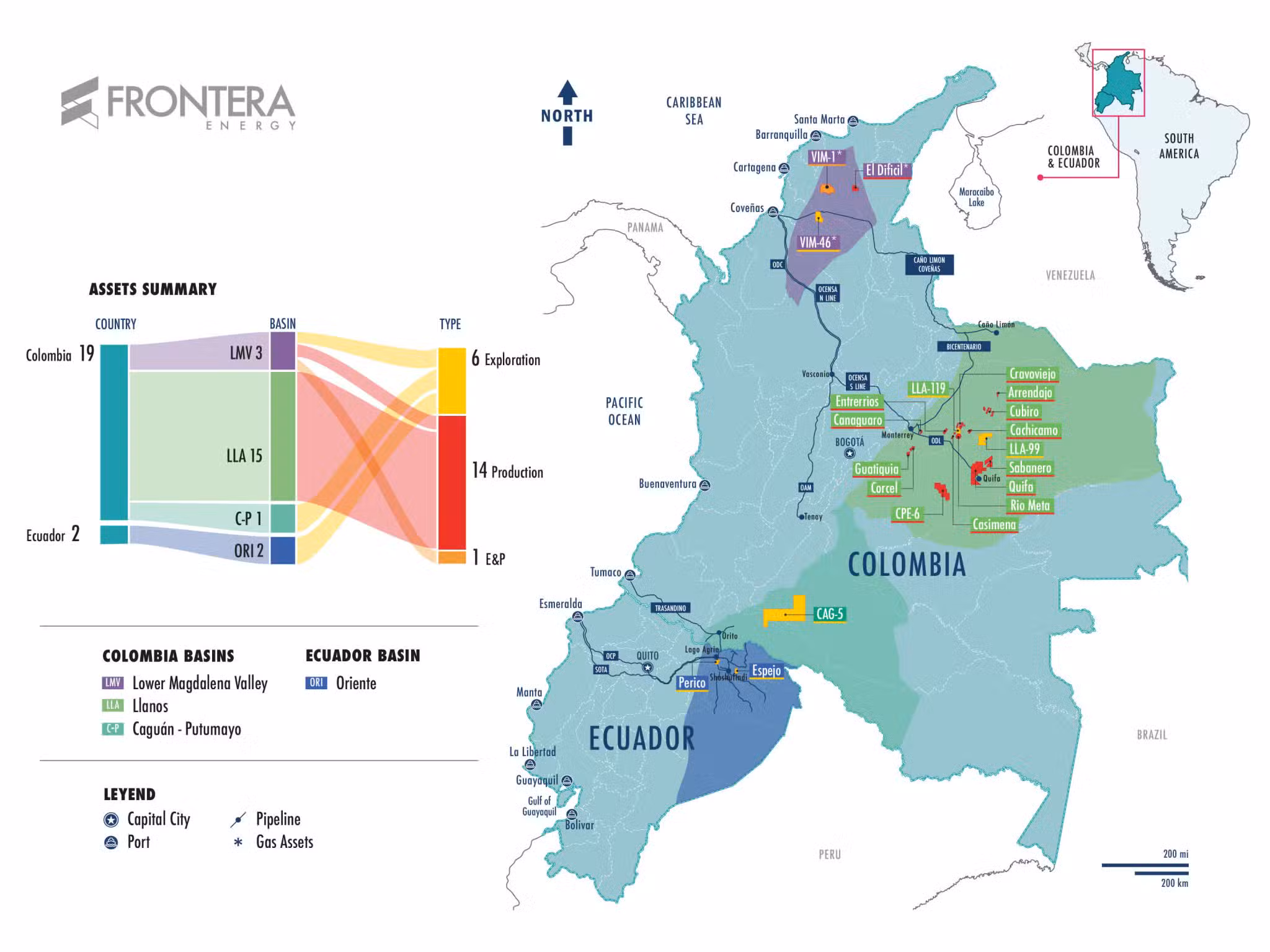 Entre los principales activos destacan 17 bloques de exploración y producción en regiones como Meta, Casanare, Putumayo, Caquetá, Bolívar, Cesar y Sucre. Además, Frontera Energy mantiene también operaciones importantes en Ecuador.
