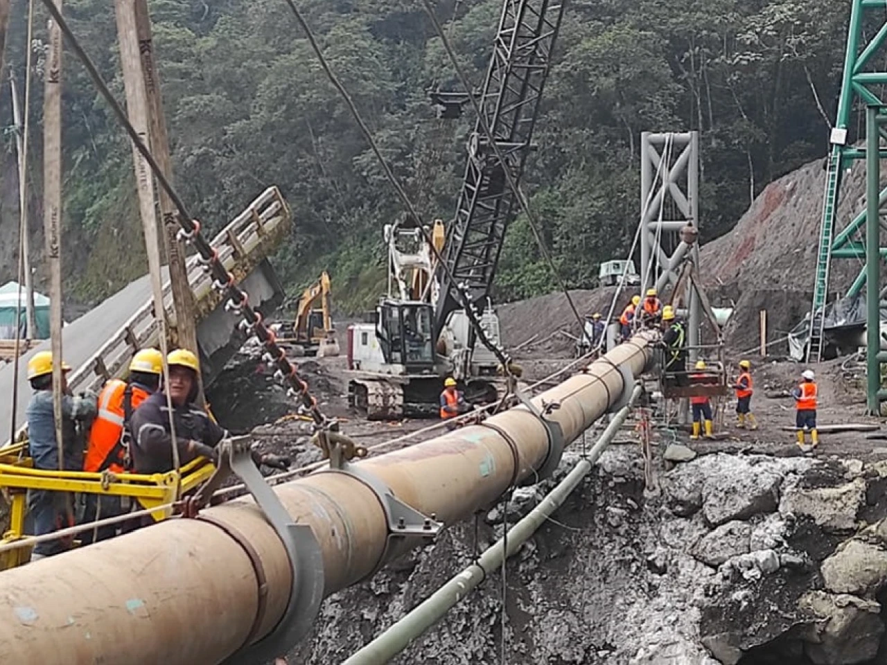 Con el apoyo del Cuerpo de Ingenieros del Ejército ecuatoriano, Petroecuador colocó una torre de soporte del sistema de oleoductos en la zona del puente sobre el río Marker / Foto: cortesía Petroecuador