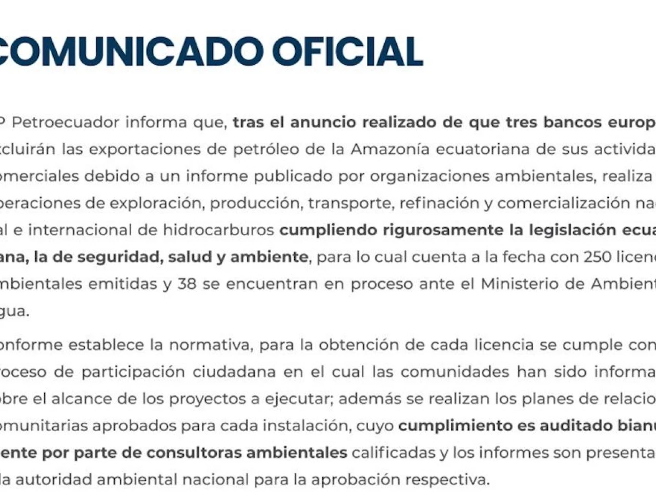 En un comunicado, la estatal ecuatoriana aseguró que sus actividades de extracción de crudo, que se concentran en la zona amazónica del país, cumplen de forma rigurosa la normativa nacional, por lo que ha obtenido 250 licencias ambientales y otras 38 se encuentran en trámite en el Ministerio del Ambiente.