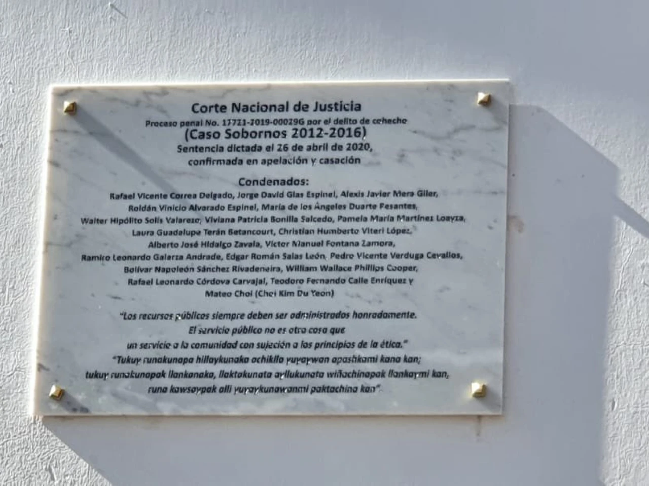 La orden de colocar una placa forma parte de la reparación inmaterial de la sentencia por el delito de cohecho contra Correa y el exvicepresidente Jorge Glas, quien cumple prisión por otro caso de corrupción, esta vez relacionado con la trama Odebrecht.