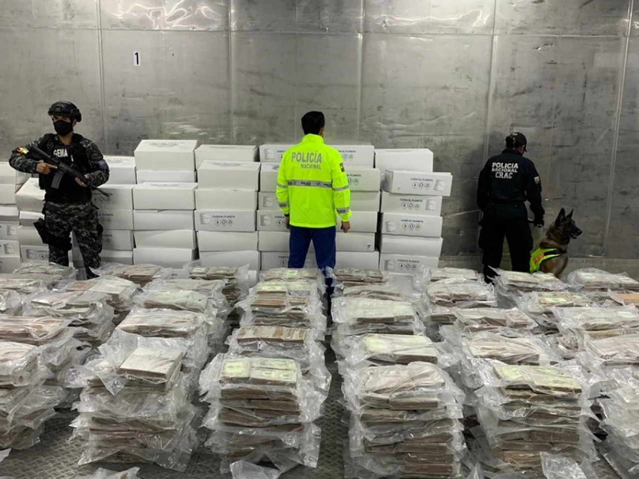 El alijo fue descubierto en un puerto de la ciudad de Guayaquil, en un cargamento de pescado congelado, entre el que se ocultaban 1.450 paquetes que sumaban 1,448 toneladas de cocaína