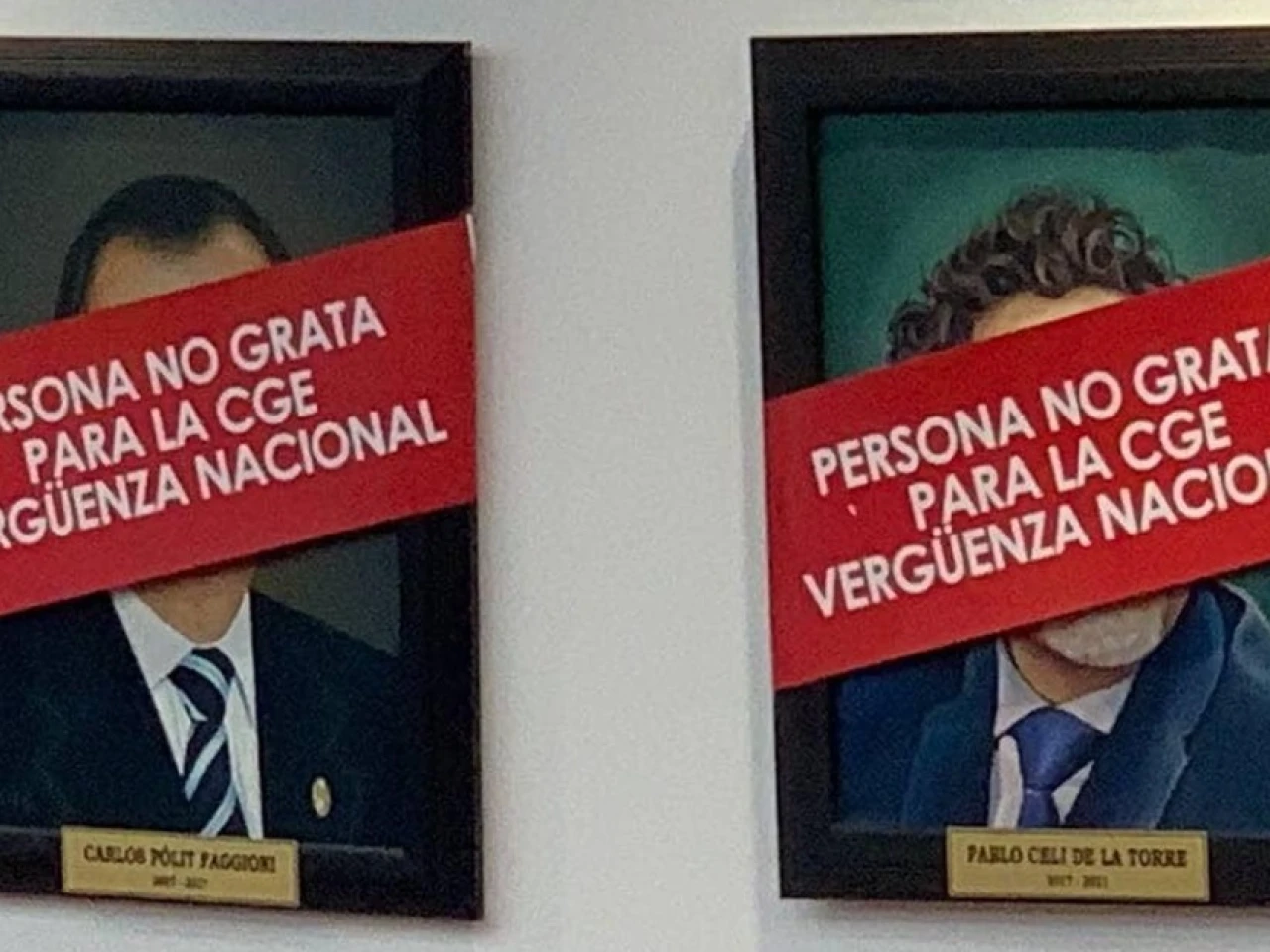 Quito- Hoy, 21 de mayo, Carlos Pólit y Pablo Celi, excontralores generales, fueron declarados personas no gratas. Sus cuadros, ubicados en la galería de expresidentes de la Contraloría General del Estado (CGE), fueron tapados. En sus rostros se colocó la frase: “persona no grata para la CGE, vergüenza nacional”.