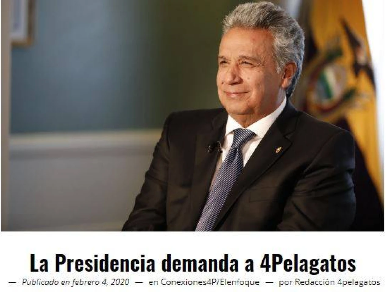 El portal periodístico 4Pelagatos denunció este martes que la Presidencia de la República presentó una demanda ante autoridades de Holanda, donde se aloja el servidor de su sitio web, por el uso de una fotografía del presidente Lenín Moreno.