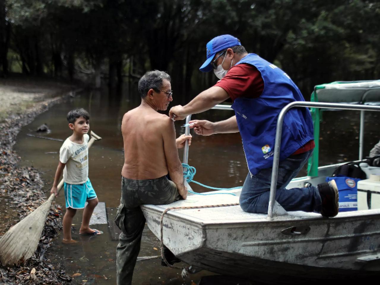 Un agente de salud vacuna a un anciano contra la gripe y el H1N1, según lo aconsejado por los funcionarios de salud para facilitar el diagnóstico de coronavirus, en medio del brote de la enfermedad del coronavirus, a lo largo de las orillas del río Negro, donde viven los Ribeirinhos (habitantes del bosque), en Manaos, Brasil, 2 de abril de 2020. © Bruno Kelly / Reuters