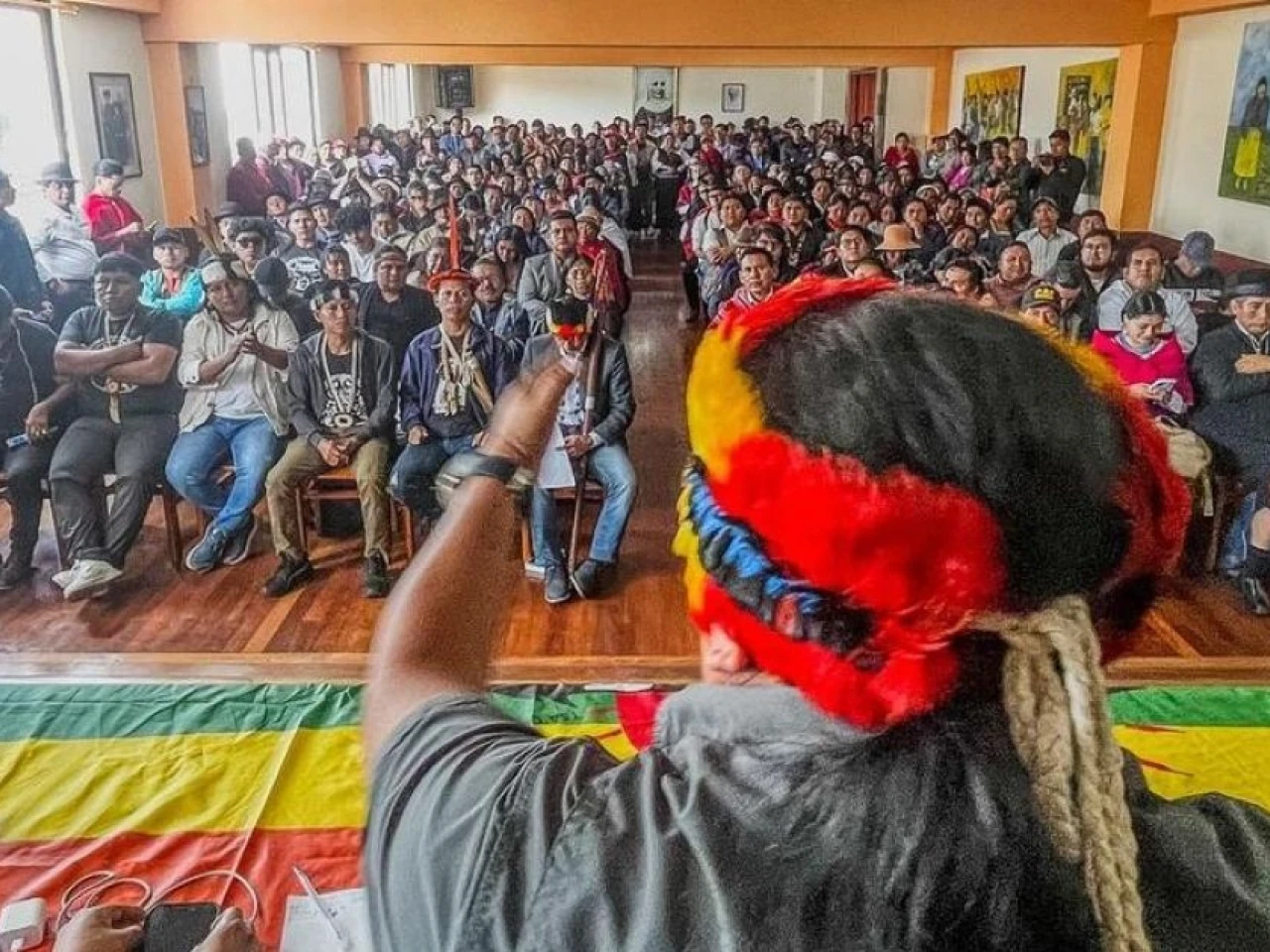 La medida, anunciada por el titular de la Conaie, Marlon Vargas, contó con la presencia de alrededor de 150 dirigentes de pueblos y nacionalidades, entre ellos representantes de la Confeniae y Pachakutik.