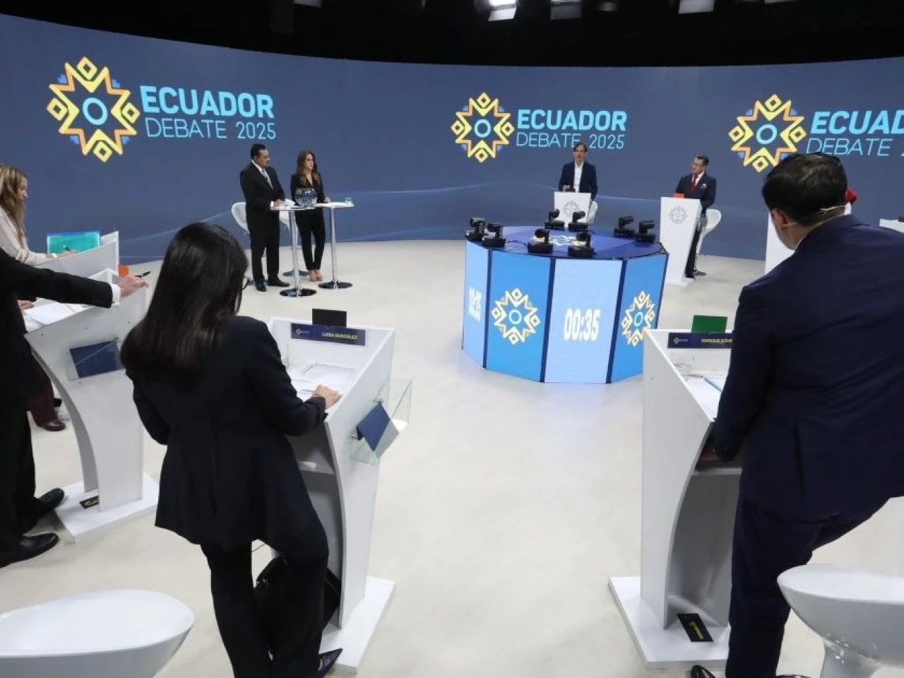 Durante el debate, el único obligatorio para todos los candidatos, no se dio el enfrentamiento más esperado entre Noboa y Luisa González, la candidata del correísmo, pues los dieciséis candidatos quedaron divididos en dos grupos de ocho, sin que coincidiesen los dos máximos favoritos para pasar a la segunda vuelta de las elecciones según las encuestas.
