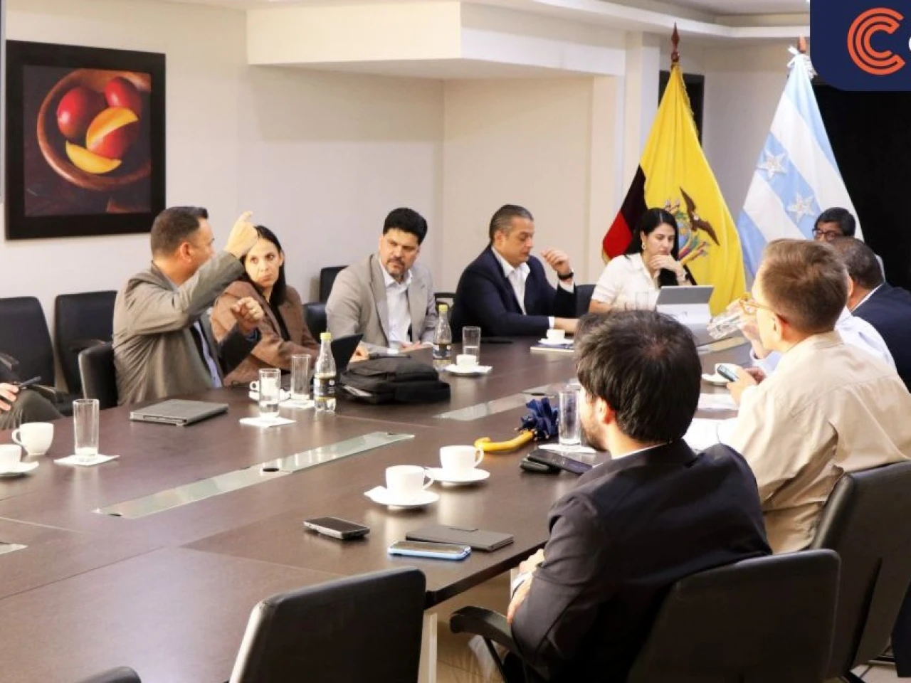 Durante el encuentro se analizó la sobretasa impuesta por Estados Unidos a determinados productos ecuatorianos. El ministro informó sobre las gestiones diplomáticas y comerciales emprendidas por el Gobierno y señaló que se mantiene un seguimiento permanente al tema debido a su impacto en el comercio exterior.
