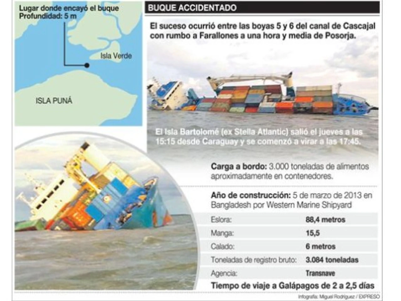 El Baltic Betina está dañado y el Isla Bartolomé comenzó el miércoles por la tarde a hundirse. Ayer, aún un grupo de personas intentaba con ayuda de remolques y lanchas -según conoció EXPRESO de fuentes oficiales- salvar la carga del buque de 88 metros de eslora (largo) que se dirigía con alimentos, principalmente, hasta San Cristóbal y Santa Cruz.
