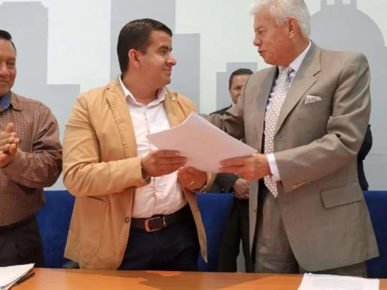 El alcalde de Archidona, Andrés Bonilla (izq.) y el gerente de la Empresa Metropolitana de Agua Potable y Saneamiento, Carlos Uriarte, firmaron el convenio. Foto: El Telégrafo