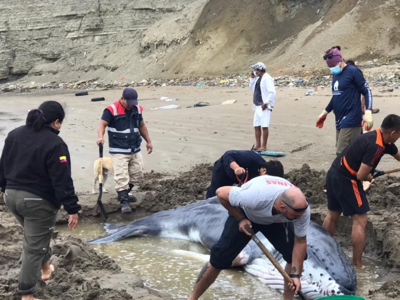 Los ciudadanos y los miembros de las instituciones articuladas usaron palas "para crear una piscina natural que permita al cetáceo mantenerse hidratado hasta que suba la marea y pueda regresar al mar", indicó el ECU 911.