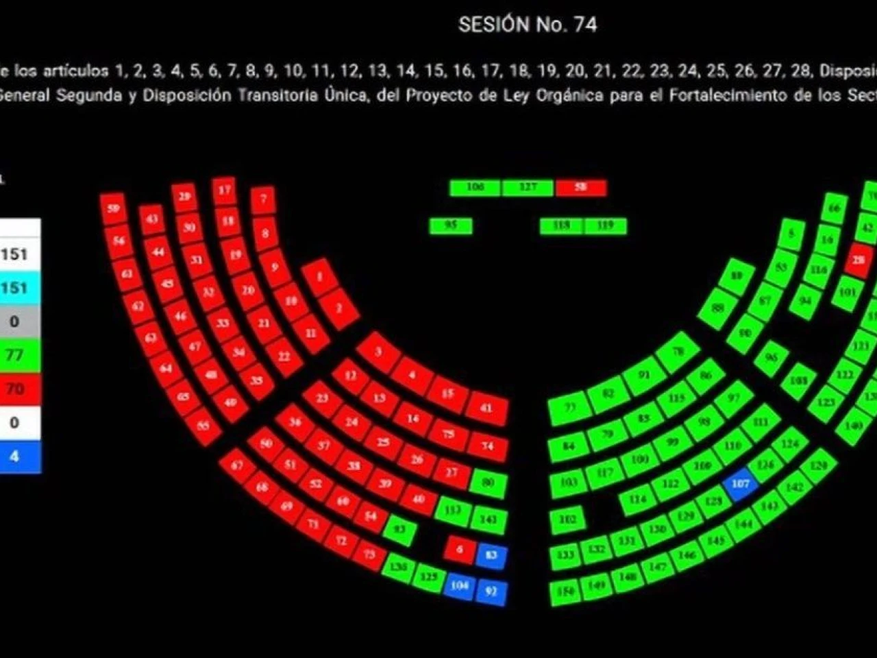 Quito- La Asamblea Nacional del Ecuador aprobó, con 77 votos, la Ley para el Fortalecimiento de los Sectores Estratégicos de Minería y Energía, enviada por el Ejecutivo con carácter económico urgente. La sesión se realizó en la Universidad ECOTEC, en Guayaquil, y el texto será remitido al Ejecutivo para su sanción u observación.