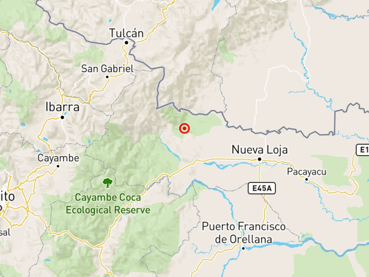 El temblor en la provincia amazónica ocurrió a las 02:30 hora local (07:30 GMT) a 30 kilómetros de profundidad, a 0,27 grados de latitud norte y a 77.35 grados de longitud oeste.