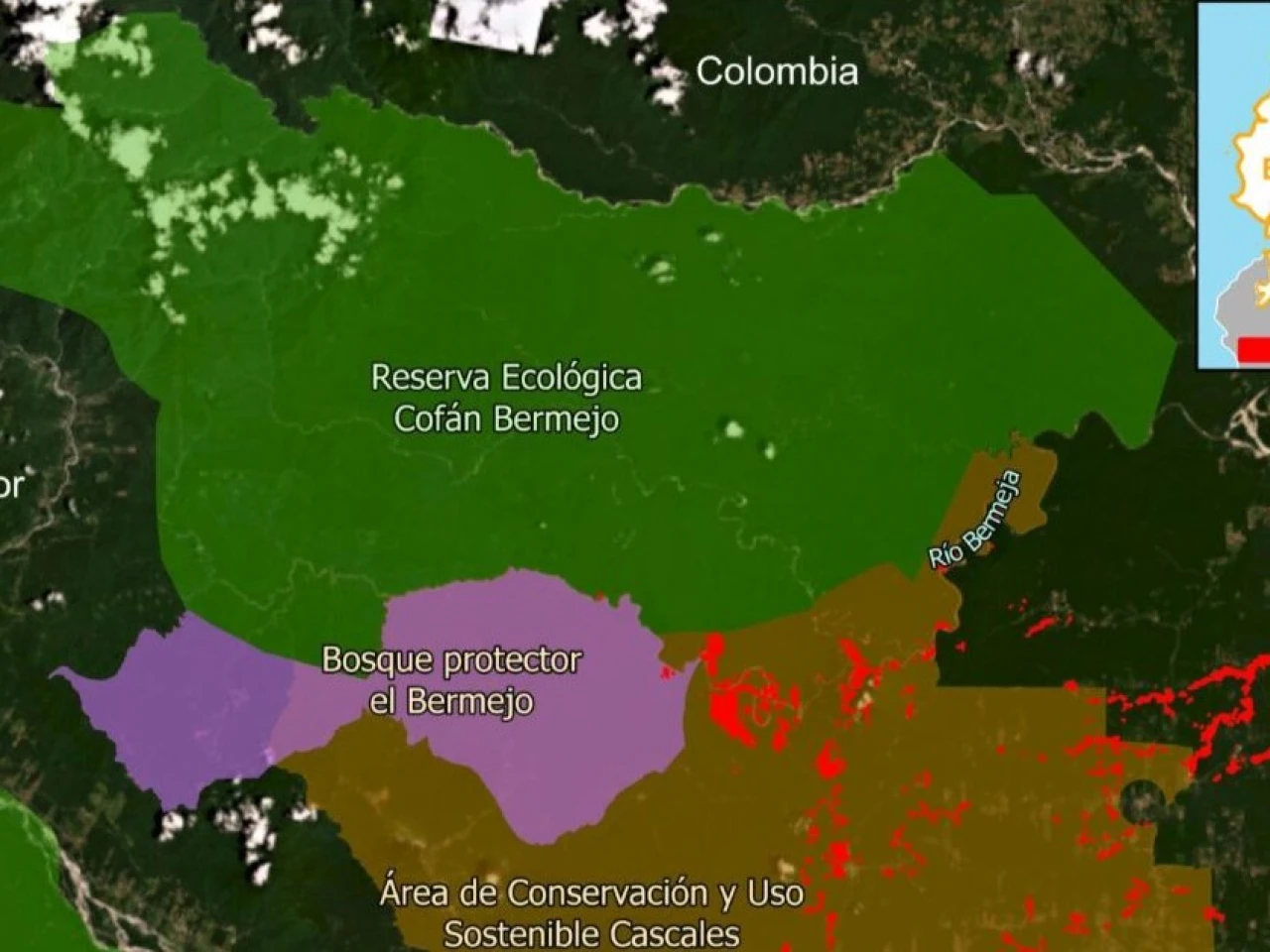 Las áreas afectadas se extienden también hacia el Bosque Protector El Bermejo y el Área de Conservación Municipal y Uso Sostenible Cascales, territorios clave para la conservación, así como en tierras pertenecientes a las etnias shuar y kichwa.