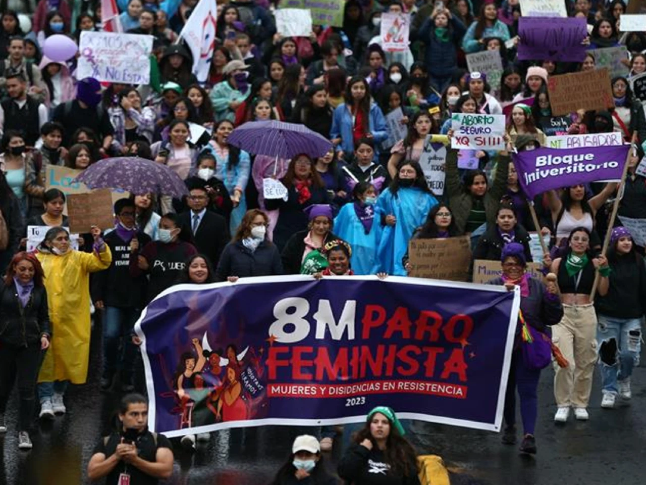 El agua que caía sobre la capital ecuatoriana no frenó la movilización por el Día Internacional de la Mujer, convocada por colectivos y organizaciones feministas, a las que también se unieron mujeres del movimiento indígena y de sindicatos.